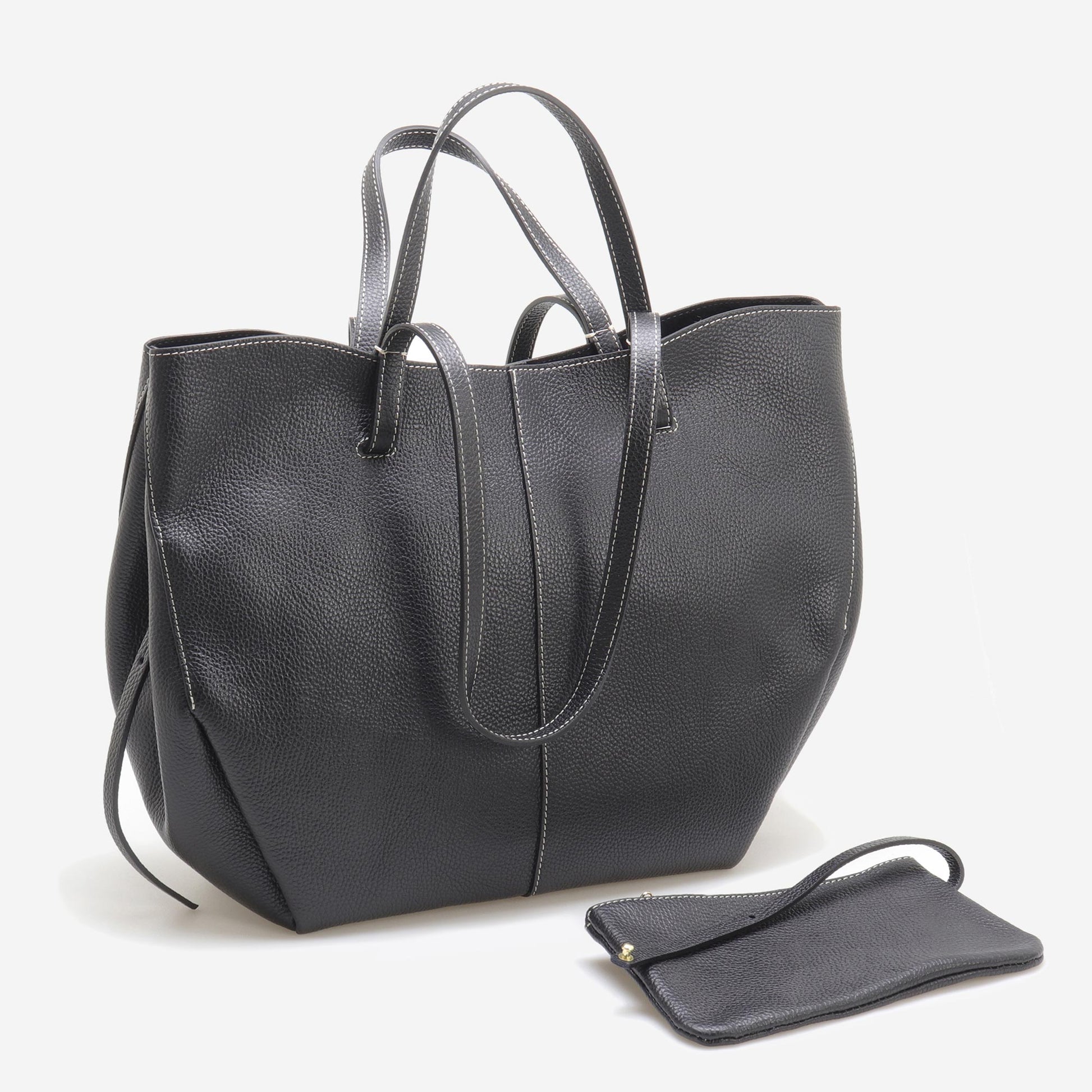 Carteira de mulher em pele com duas alças de mão e uma de ombro.