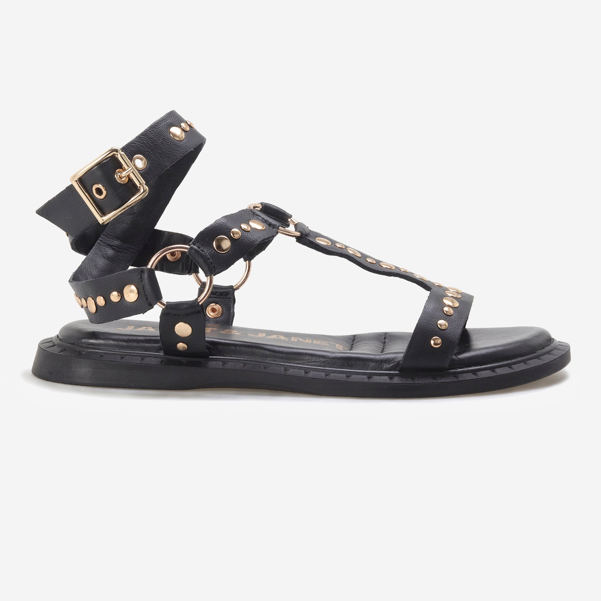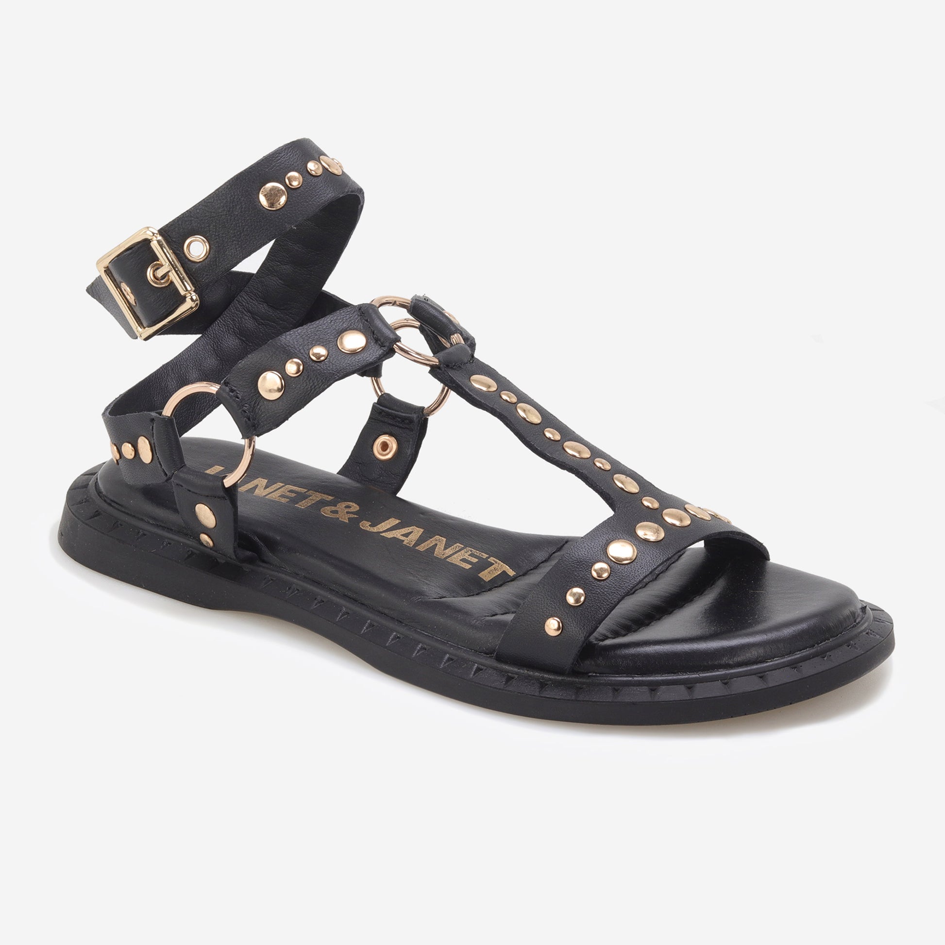 Com uma tira cruzada no tornozelo e fivela ajustável.