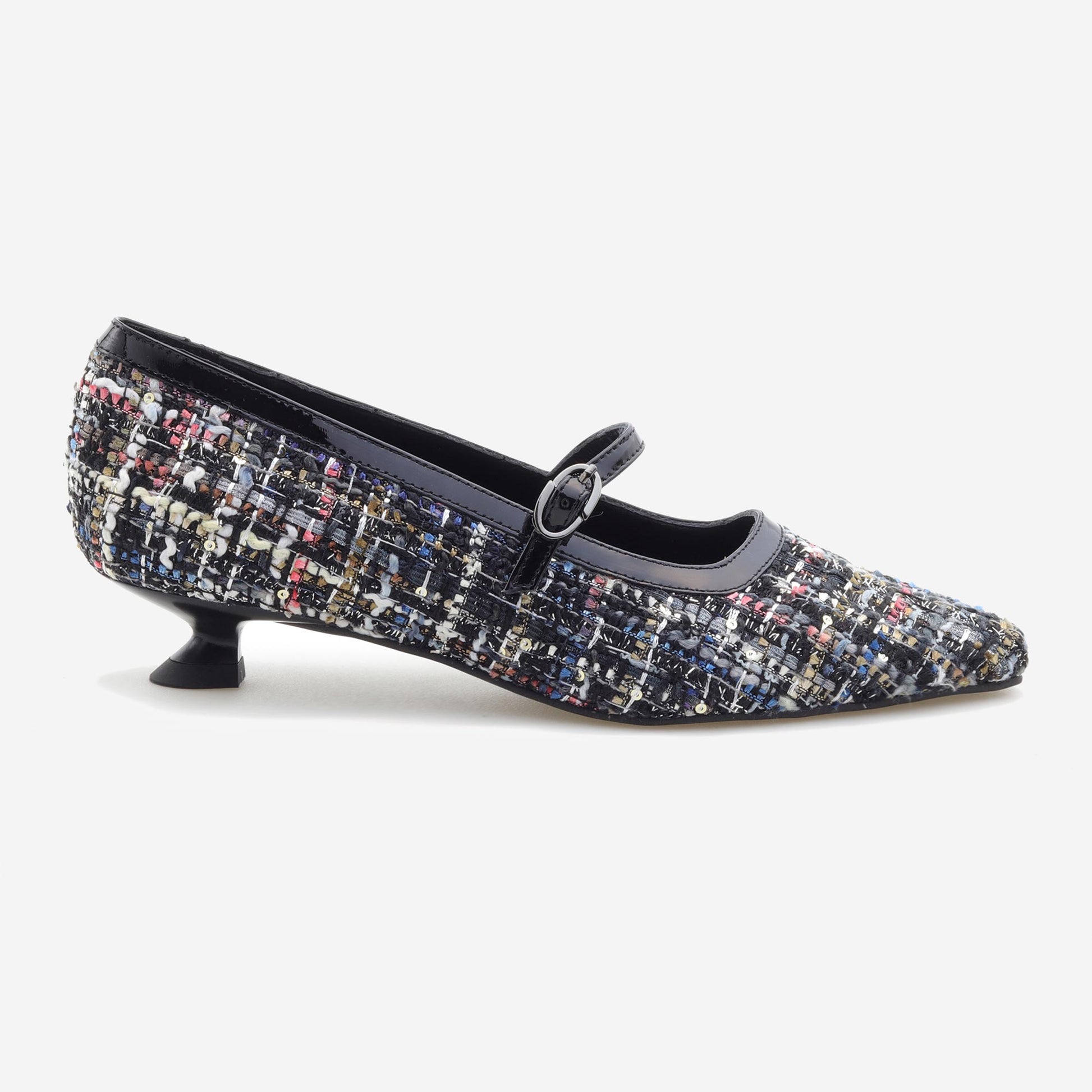 Sapatos de mulher Scarpin de modelo Mary Jane, em tecido Multicor com uma tira em verniz.